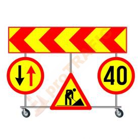 Este un suport mobil pe roți pentru montarea indicatoarelor rutiere temporare.