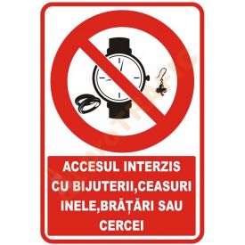 Indicator de securitate de interzicere "Accesul interzis cu bijuterii, ceasuri, inele, bratari sau cercei"