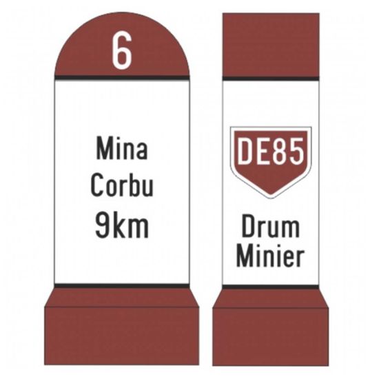 Borna kilometrica plastic drum de exploatare folie clasa 1 executata din material plastic colorat în masă materialului în maro. Pe suportul de plastic se aplică folie reflectorizantă, produsă de 3M-SUA, inscripționată conform cererii beneficiarului.
