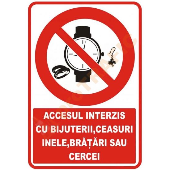 Indicator de securitate de interzicere 'Accesul interzis cu bijuterii, ceasuri, inele, bratari sau cercei'