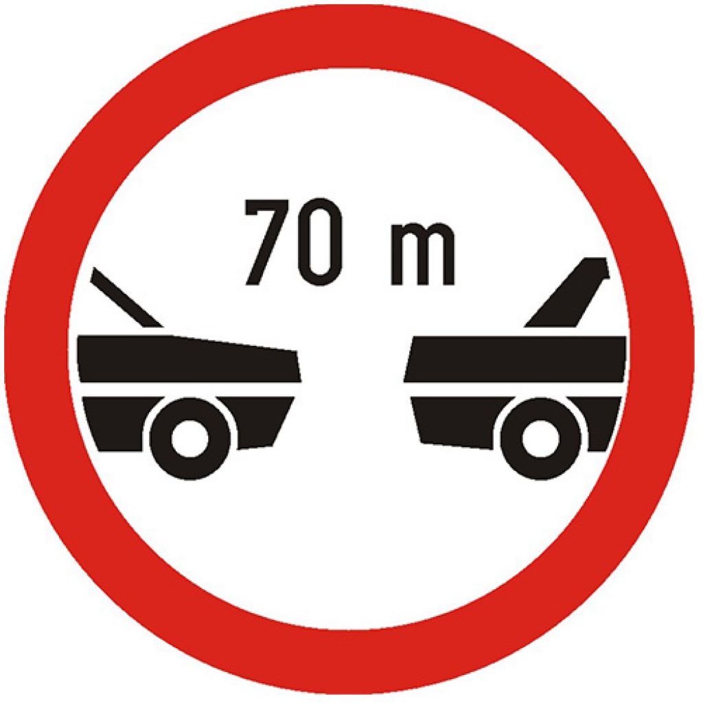 Indicatorul interzice circulatia vehiculelor la o distanta mai mica decat cea specificata fata de vehiculul din fata, si este folosit pe drumuri unde exista riscuri, cum ar fi: