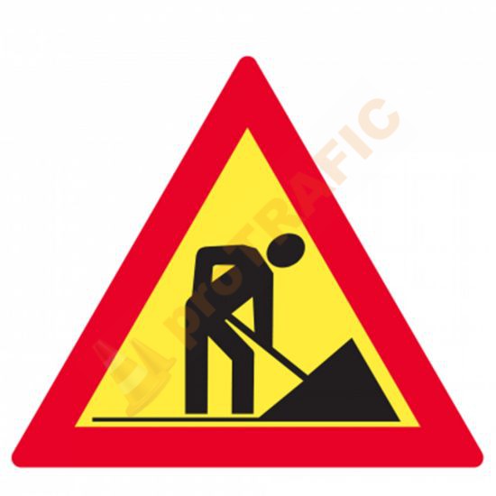 Indicatorul triunghiular din imagine se instalează la 20-200 m de sectorul de drum pe care se execută lucrări. Fondul de culoare galbena semnifică caracterul temporar al lucrării. La întâlnirea acestui indicator, Conducătorul auto este obligat să reducă viteza.