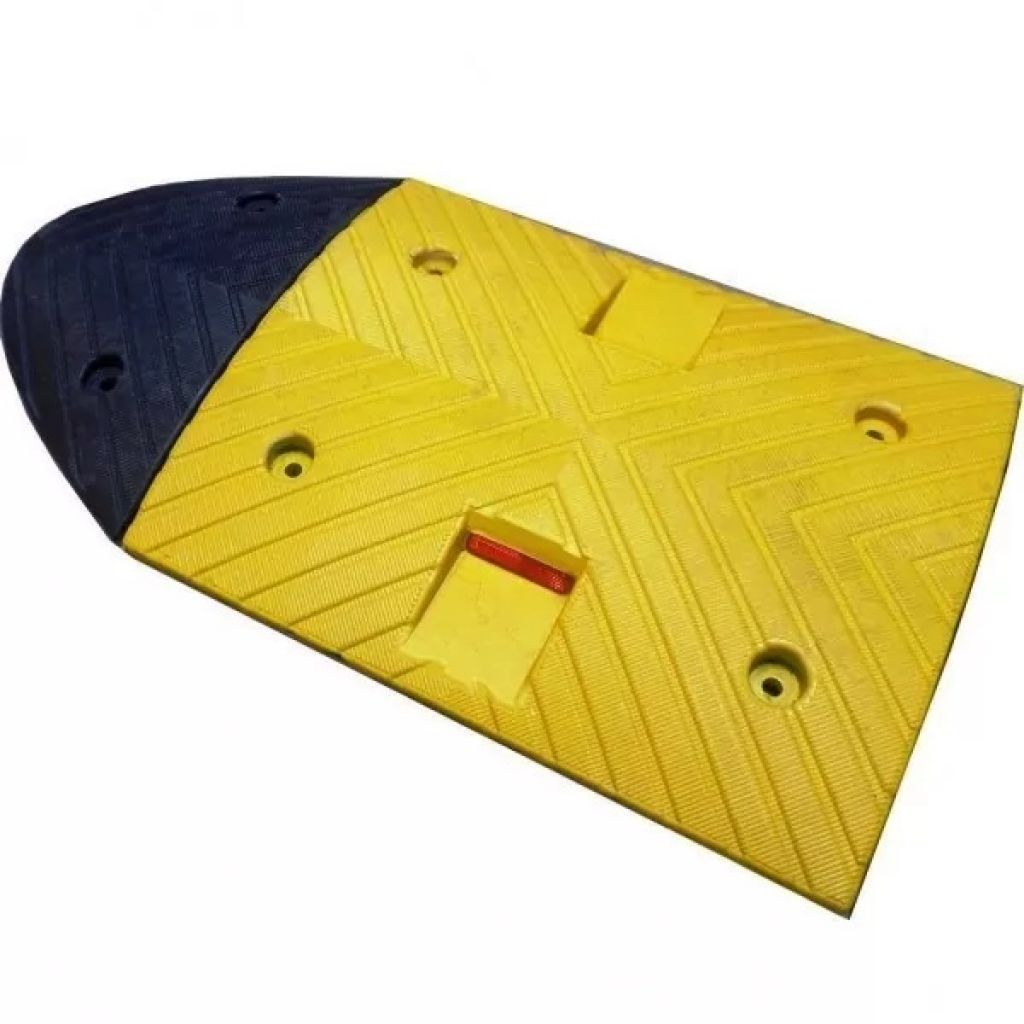 Limitator de viteza din cauciuc cu catadioptru 500x400x50mm pentru încetinirea vitezei pâna la 20 km/h, este folosit în apropierea scolilor, gradinitelor, în parcarile centrelor comerciale, la intrarea în parcare, benzinarii si în toate zonele unde se doreste limitarea vitezei. Intra 2 bucati la metru linear.
