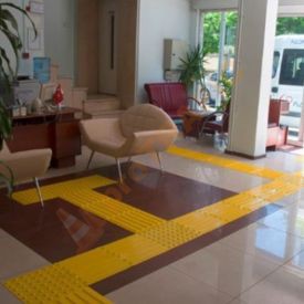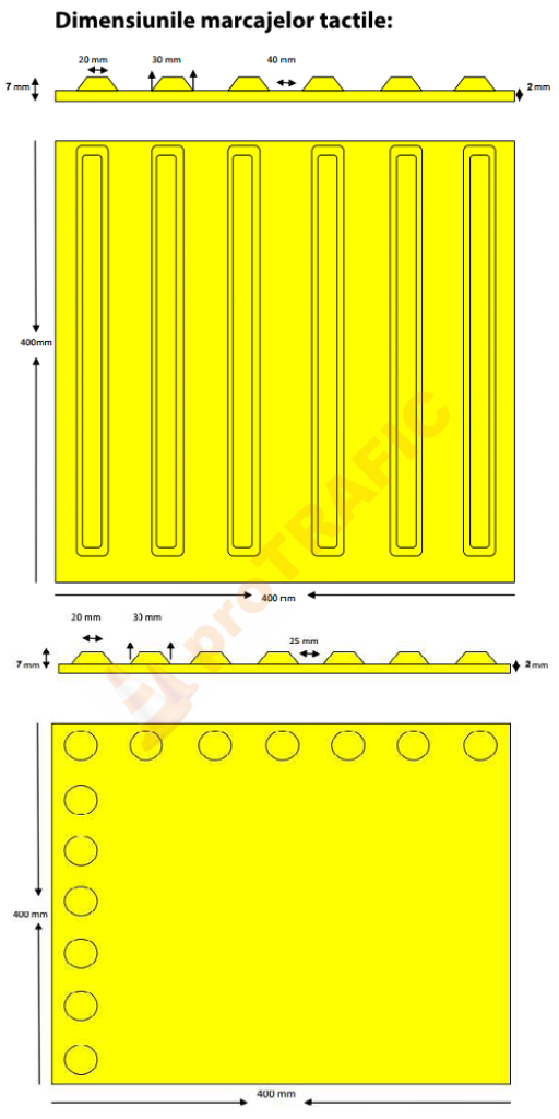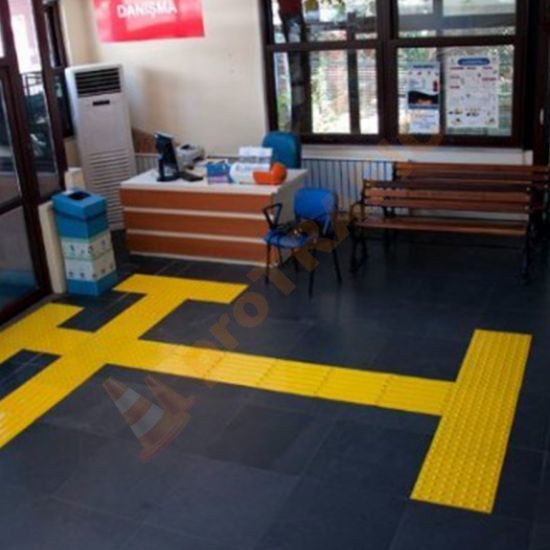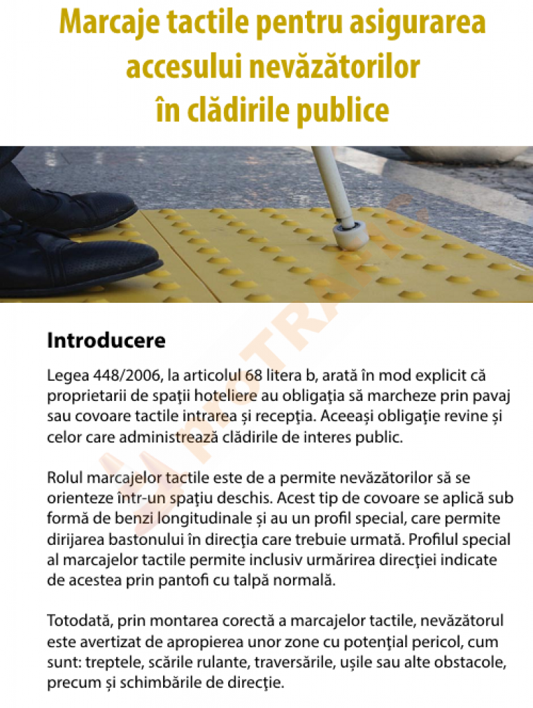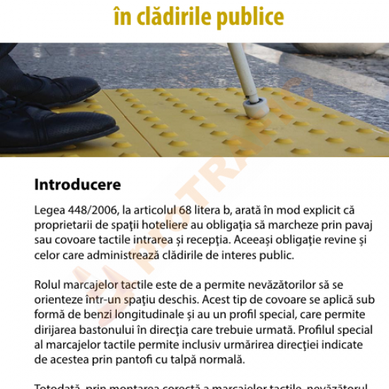 Marcaj tactil pentru nevazatori STOP este un produs special ce este aplicat pe trotuare sau in spatii publice conceput pentru a avertiza persoanele cu deficiente de vedere asupra unor zone periculoase sau schimbari de trase precum peron de gara, metrou sau tranvai ori scari sau treceri de pietoni. Acest produs este realizat din material rezistent cu textura ce variaza in functie de model.
