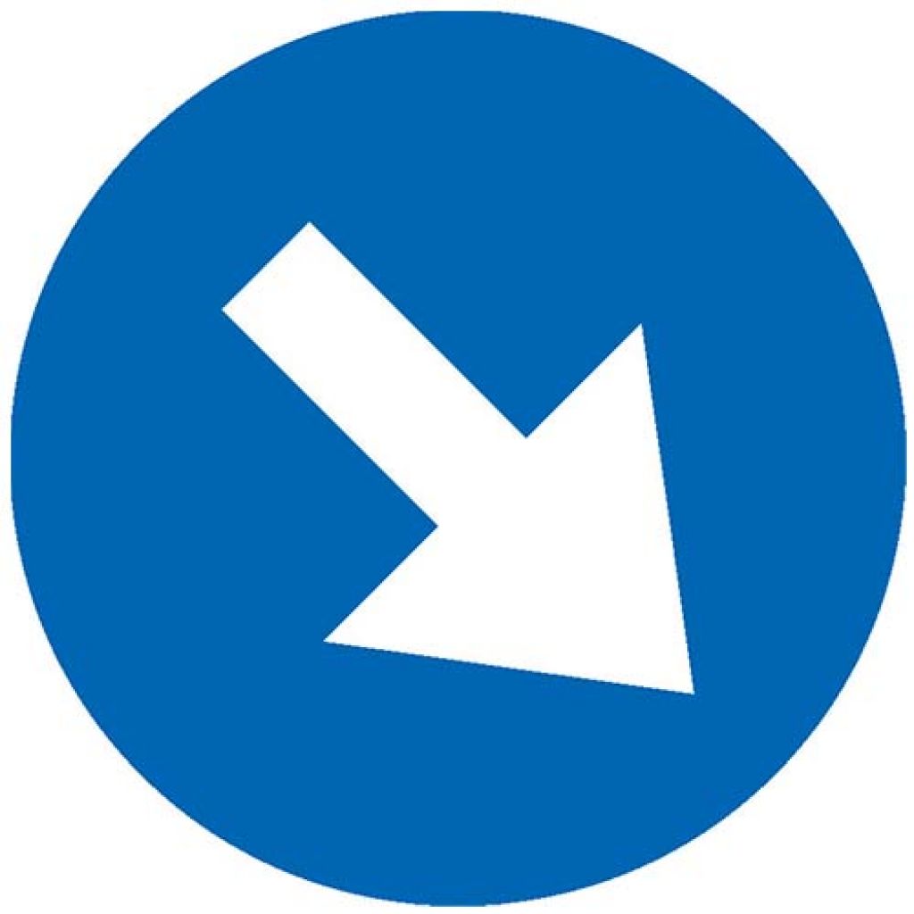 Semn rutier temporar D5 Ocolire Dreapta, D=800mm, clasa 2 se amplaseaza inaintea unui obstacol aflat pe partea carosabila, pe care conducatorul auto trebuie sa il ocoleasca in sensul indicat de sageata. Refugiile statiilor de tramvai sunt semnalizate cu astfel de indicatoare.