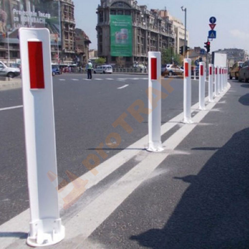 Stalp de ghidare lamelar cu suport confectionat din material plastic, cu o secțiune transversală în formă de arc de cerc și o nervură perimetrală, care le conferă o elasticitate perfectă. Acestia sunt rezistenți la coliziuni repetate ale vehiculelor, cu deformări minime și fără a produce pagube asupra vehiculelor. Pe partea de sus a stâlpului, pe ambele fețe, sunt prezente amprentei pe care este aplicată folie reflectorizanta de culoare albă, respectiv roșie.